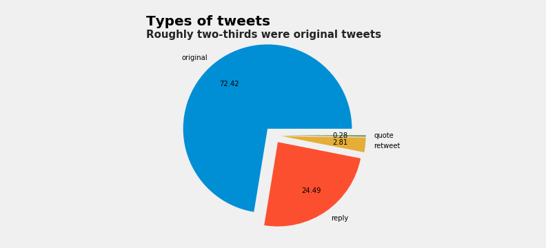 Based on the pie chart above, we can see that roughly two-thirds of the tweets from the @CFPB page were original tweets. Almost one-third were replies to others, only a very small percentage (2.81%) were retweets, and 0.28% were quotes.