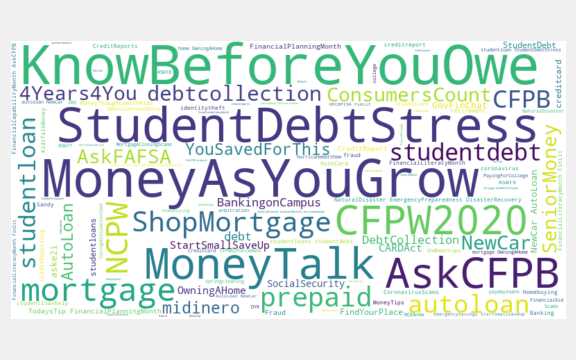 The word cloud visually shows the frequency of the used hashtags from the Twitter dataset. #KnowBeforeYouOwe, #MoneyAsYouGrow, and #StudentDebtStress were most frequently used and likely point toward their focus as an organization, such as about thinking before borrowing, student debt, and saving up money. They were closely trailed by #MoneyTalk, #AskCFPB, and #CFPW2020.