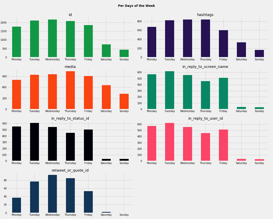 The bar graphs give an overview of the activity based on the days of the week. The weekend was clearly not as active when compared to Tuesday-Thursday. Furthermore, the retweet and quote id were the least active, overall, particularly on Sunday.