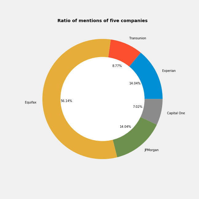 Consumers often have complaints about the credit bureaus or large banks. In fact, companies such as Equifax have gone through very public issues like the 2017 data breach, which may have been reflected in this dataset. After checking to see how often there were mentions of “Equifax,” “JPMorgan,” “Experian,” “Transunion,” and “Capital One,” it was not surprising to see that Equifax was holding the number one spot among these companies, representing around 56% of the mentions among these. Another credit agency called Experian was in second, followed by JPMorgan with around 14%. This is followed by another credit agency called Transunion with almost 9%, and then Capital One with around 7%.
