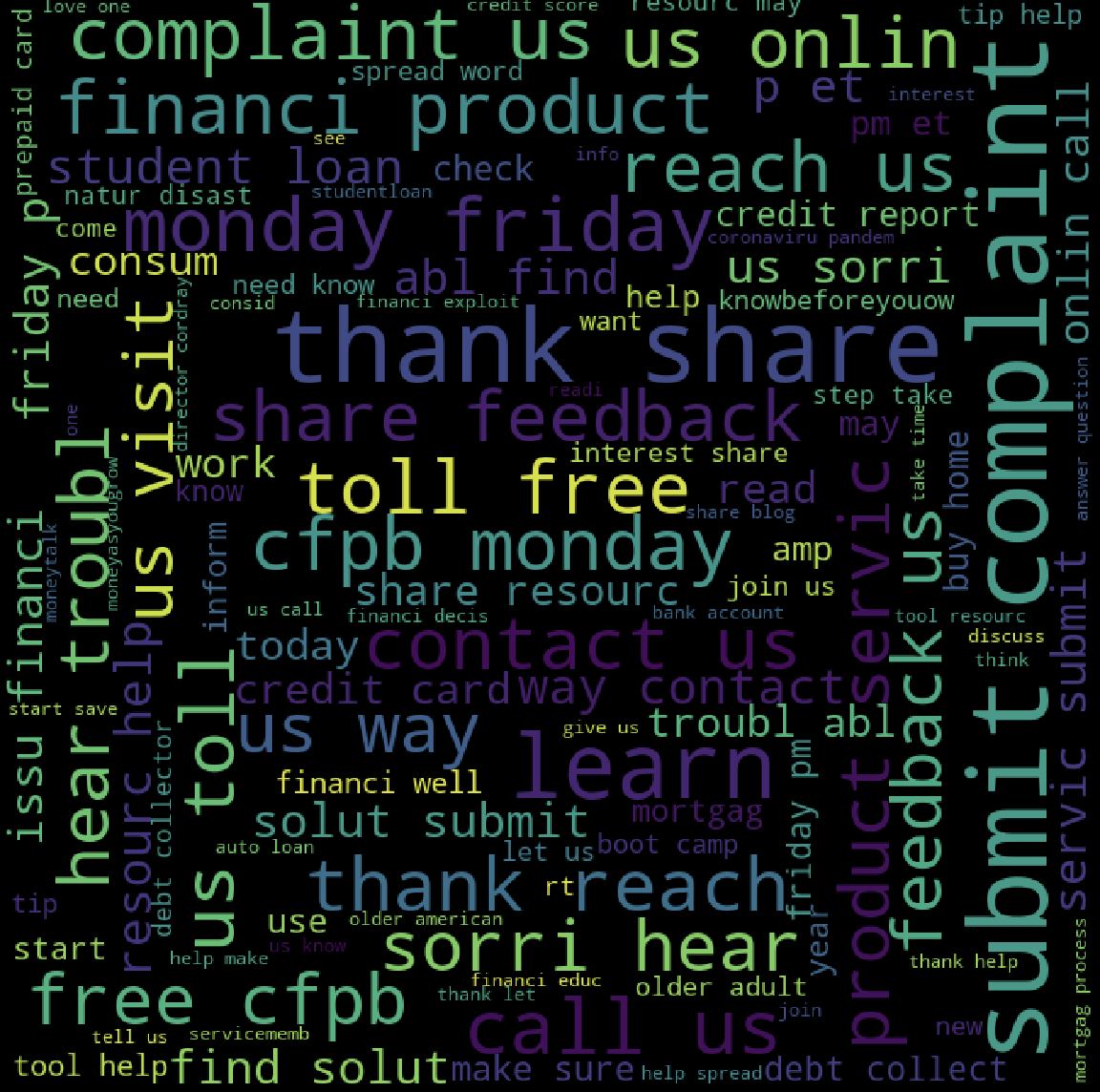 Cleaning and preparing the data such as through the use of stop words allows us to get a more accurate understanding of the data and text itself. Not surprisinly, the most common text appears to be about submitting complaints which is expected since the CFPB has a very large complaints database that is regularly updated and consulted. What is interesting is that phrases such as “thank,” “reach,” “contact,” “share,” and “submit” are engaging and clear calls to actions, signaling that the CFPB appear to be trying to engage with their audience.