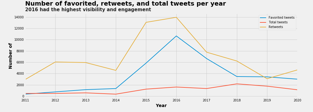The year 2018 had the most number of tweets, overall. Also, the year 2020 had the lowest number of tweets when comparing from 2015 to today. In terms of favorited tweets, 2016 overwhelmingly had the most when compared to the whole time period between 2011 to 2020. In contrast, the year 2011 had the lowest number of favored tweets and this value has never been as low as that after, but rather, in general, has only increased. The year 2014 to 2016 saw a very sharp and significant hike in the number of favorited tweets. With regards to the retweets, it is the most unstable metric, having reached its lowest point in 2011, its highest in 2016, and shifting in between.
