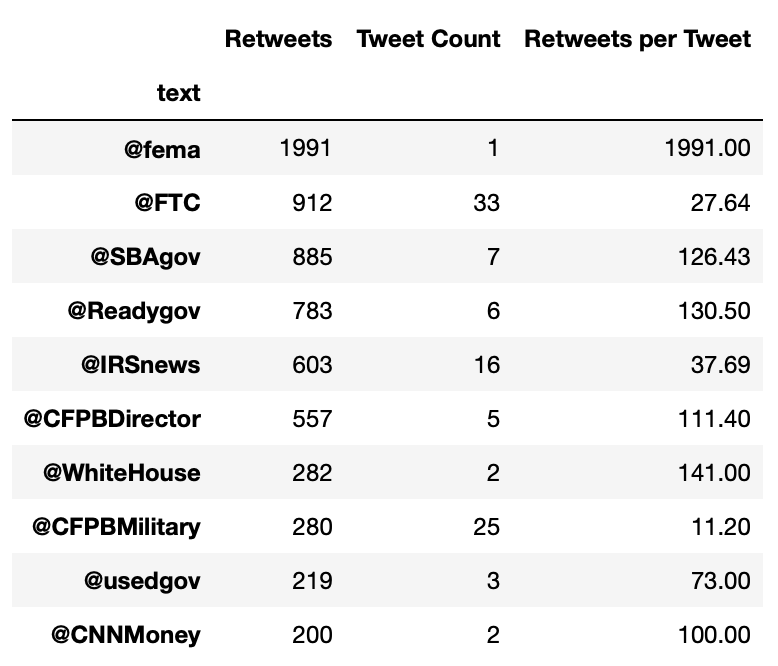 The table shows some interesting information about the different retweets metrics. For example, the @fema retweet seems to have been the best-performing one. There was one RT (tweet count) of @fema which garnered 1,991 retweets, the highest value, giving it a very impressive performance and competitive average over the others.